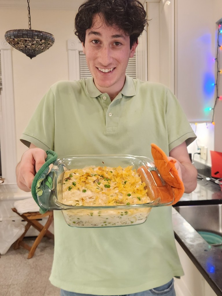 Special shoutout to Karis for sharing with me a special household staple from her childhood. This dish is egg noodles and peas combined with tuna. I think Karis’s version had the actually bone from tuna fish baked in the casserole but that was one step too gross for me so it’s just tuna from a can.