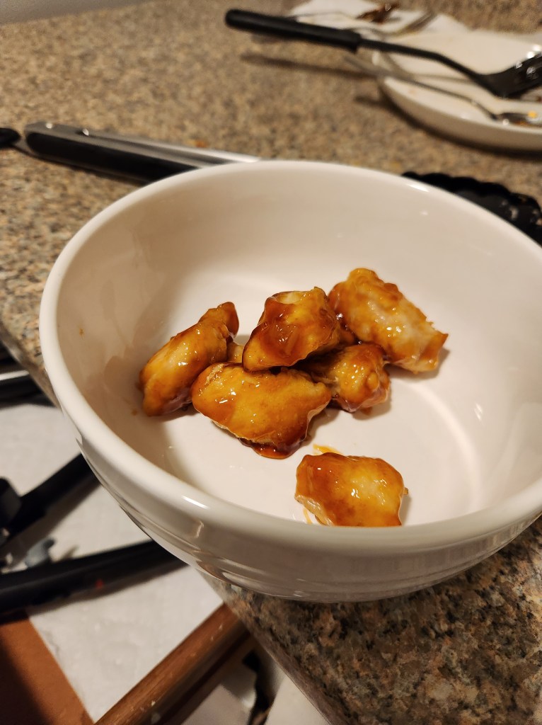 Wow Max – you really know how to make a dish look appetizing. Just 6 chicken nuggets in a bowl. Nothing else. Anyway – the orange chicken recipe I used was amazing and I promise I made more than 6 and that I had rice with it.