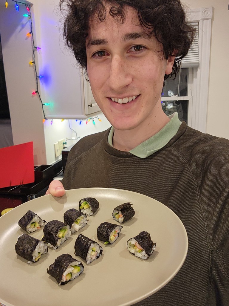 Dealing with sticky rice is the worst! I have so much respect for the time and energy it goes into making sushi rolls. Thank you to Rai as well for lending me a rolling mat 🙂